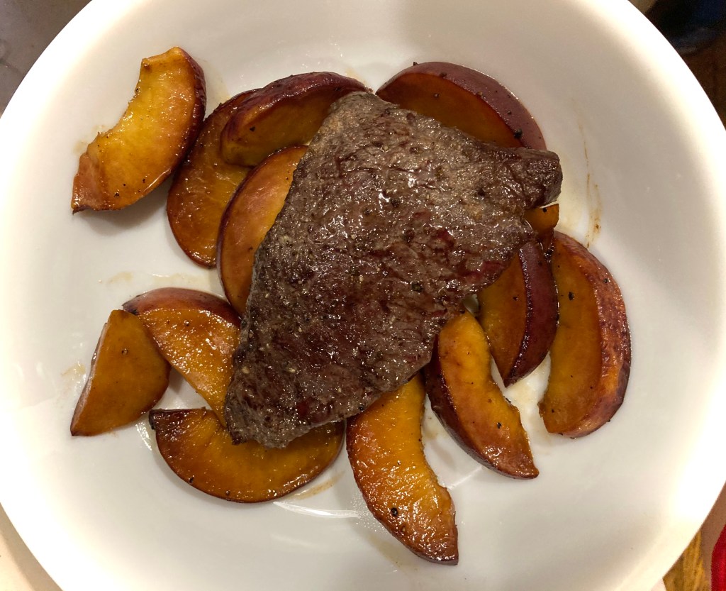 Stoudemire Farms Denver Steak is simply juicy when cooked right. I got inspired by July 4th and had always wanted to try the peach steak combo. I used my Dutch oven to cook the peaches with the leftover steak juices with a little Chinese Fujian cooking wine. Peaches carmelize and the natural sugar intensified in flavor. Also I had no clue who Stoudemire is. I remember in an Instagram post that he was excited to go to a golf tournament and was not able to come to his farm stand. But of course, I got corrected at his farm stand at Union Square Greenmarket. I know F-O-O-D. Who cares about basketball!?!